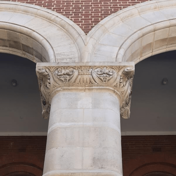 The Jubilee Building doesn’t use the post and lintel system, but the Romanesque series of springing arches. Even so, there has to be a point of mediation between the arch and the column and here it is, no surprise, achieved in a perfect way. The capitals of the columns, which are roughly of the Corinthian order, are a delight to examine. The solitary leaf at the base has become a riot of intertwining organic forms at the top. Not only is this a moment for the eye to pause and simply admire beauty, and it suggests the arches are resting on a soft bed, not a harsh stone column. More like sleeping on grass than curled up on a concrete floor. This is the architecture of kindness.