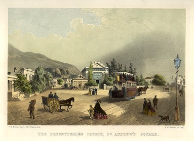British landscape painter Thomas William Bowler was one of the top artists working in South Africa during the 19th century. After a brief stint as assistant astronomer in the Cape of Good Hope, Bowler settled in Cape Town, where he established a reputation as a talented artist and drawing teacher. Thanks to him, we have images of some 35 years of the Cape’s history, including a wonderful picture (c.1864) of the Presbyterian church in St Andrew’s Square. The church, called St Andrew’s of course, is in the fashionable Greek Revival style (there’s your callback to Keats) and was designed in 1827 by Henry Willey Reveley. Bowler and Reveley never met, since the former arrived in Cape Town in 1838, while Reveley had left in 1829 to accompany Captain James Stirling to the brand-new Swan River Colony in Western Australia. I’ll have much more to say about St Andrew’s in a moment, but for now I want to note the streetlamp, with inevitable dog next to it, in Bowler’s painting. A streetlamp, like the church itself, lit with whale extract from the plant installed at the church in 1842.