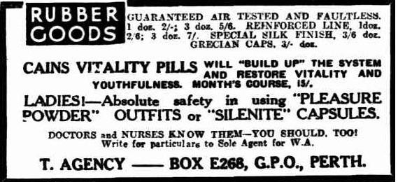 The above advert ran in Perth’s newspapers in the mid-1930s. Most of it is fairly easy to decode (the word ‘contraception’ doesn’t appear at all).